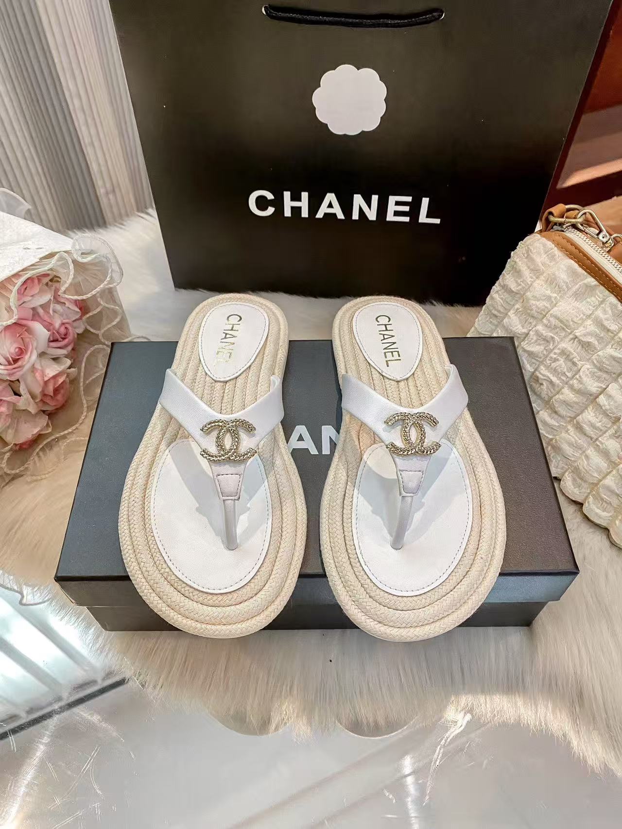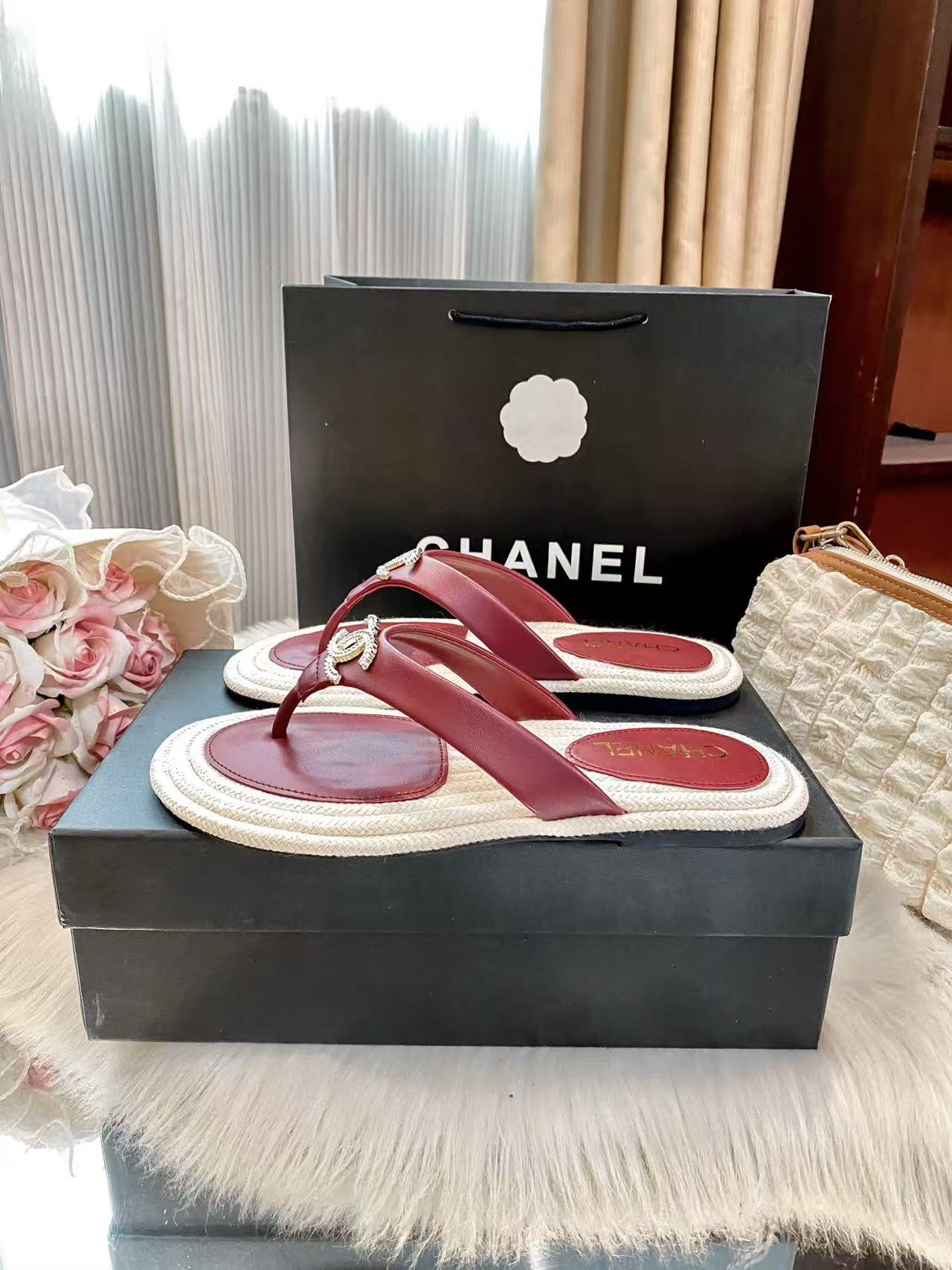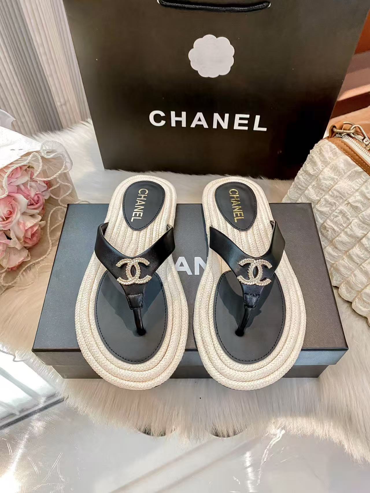 CHANE1 ダブルCカラーブロックフラットスリッパ【50%割引+送料無料】