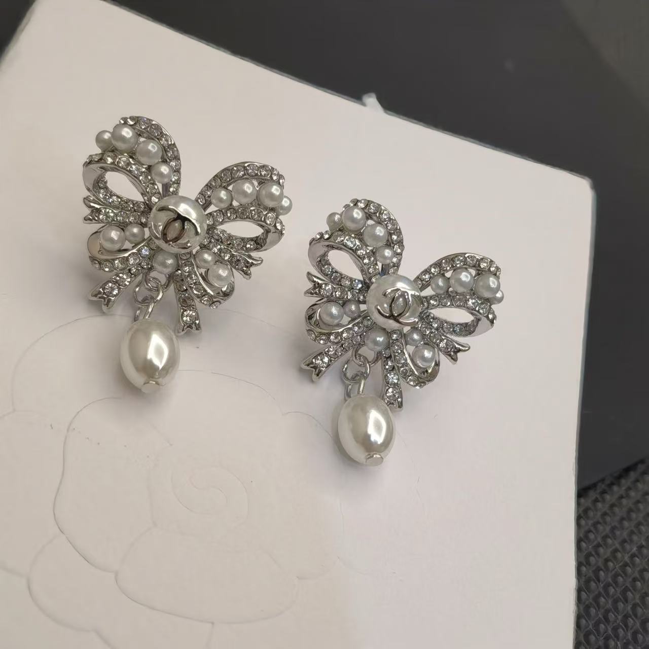 CHANE1 ダブルC ボウ パール スタッド イヤリング